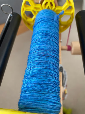 This one is called Conversations with Smaug (yes, Lord of the Rings inspired!), and it's on a positively dreamy fiber blend of 70% superfine Merino/30% mulberry silk. I think I am just going to spin it end to end and ply it back on itself. I have a feeling it will want to be spun very fine because of the high silk content, so expect another thin yarn!